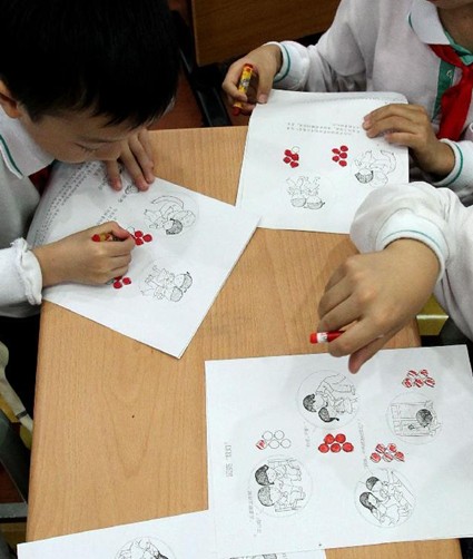 10月24日,在“性别教育课程”的课堂上,小学生们用“红灯”标识男孩女孩身体上不能被别人碰触的隐私部位。